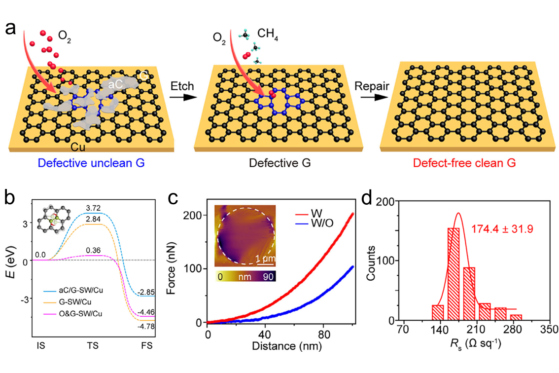 图:痕量氧辅助制备高质量石墨烯薄膜。a)痕量氧刻蚀无定形碳并促进缺陷修复示意图。b)理论计算不同结构的修复能垒,氧气存在时结构转变所需的能量最小。c)未处理(蓝色)与处理后(红色)石墨烯薄膜的力-位移曲线,经过处理后的石墨烯力学性能更强。d)经过处理后石墨烯的方块电阻直方图统计结果。
