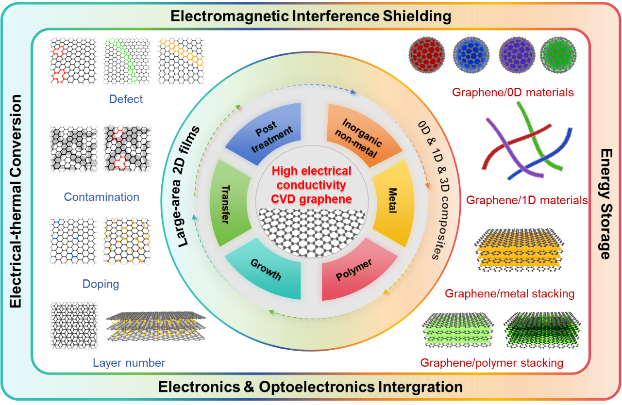 石墨烯是一种独特的材料,具有特殊的结构、卓越的性能和广泛的应用前景。特别是石墨烯优异的导电性,使其在多个领域具有无可比拟的优势。化学气相沉积法(CVD)是批量制备高质量石墨烯的主要方法,人们一直致力于逐步提高石墨烯材料的导电性。从这个角度出发,我们对过去5年来高导电石墨烯的生长、转移和后处理策略进行了全面的分析和讨论。先提出了从单层到多层的大面积石墨烯薄膜,随后我们分析了基于石墨烯的复合材料使传统的金属和非金属材料表现出增强的电学性能。最后,对CVD石墨烯材料实现更高电导率以及开发新应用的未来方向进行了展望。